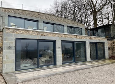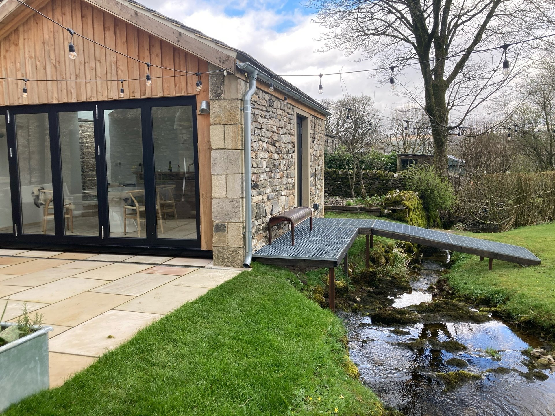Remote building from host property designed to create light and airy space in contrast to the solid host building. A glazed bridge links the two buildings and the new structure sits adjacent a small stream, generous glazed areas create an elemental feel and a real connection to the surrounding wild landscape. completed 2022, design, planning and building regulations.