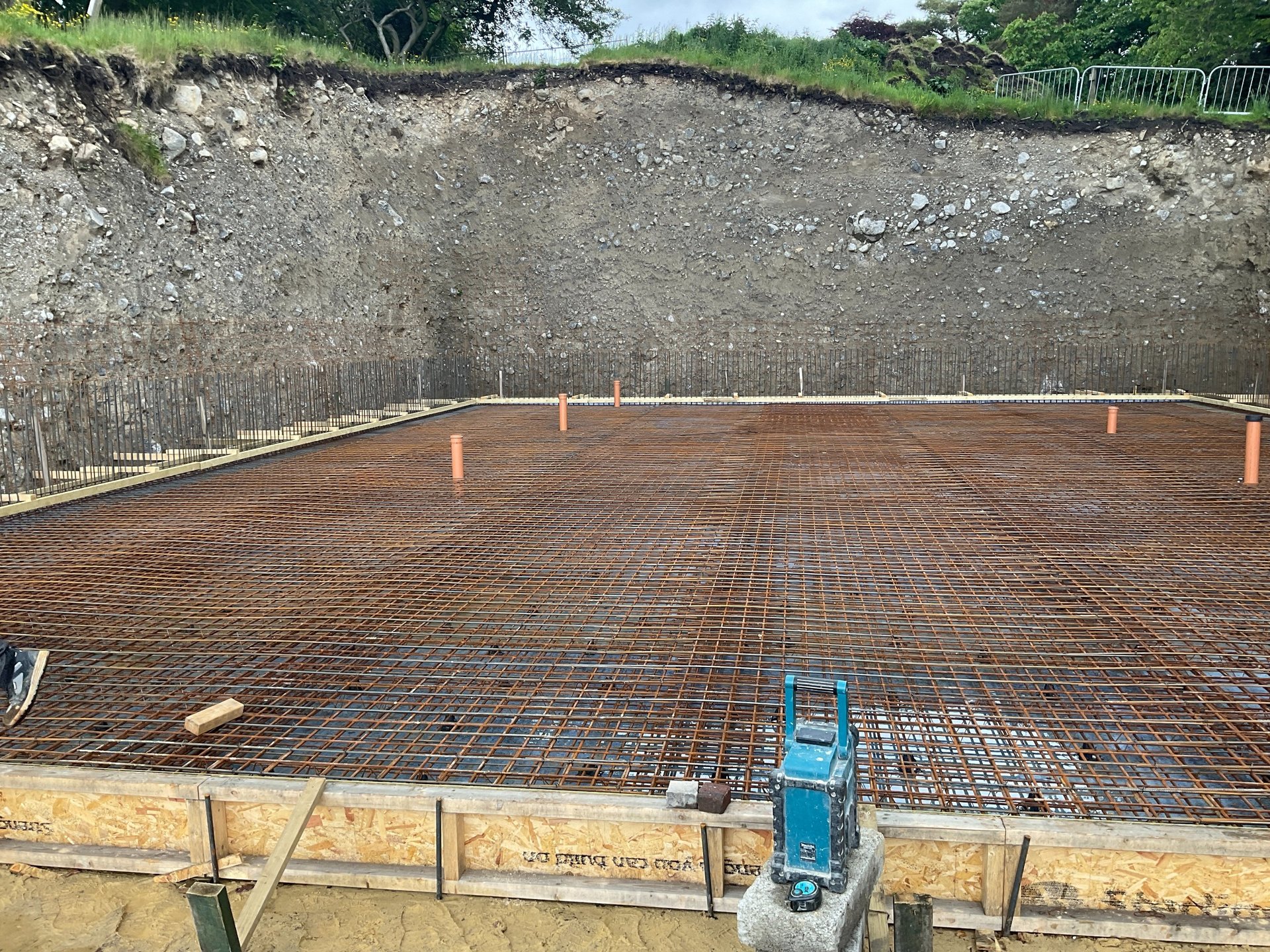 Private house built into land and covered in earth with exposed front elevation and central atrium skylight. Designed to minimise the visual impact on the conservation area site, planning secured prior to our involvement but employed to refine interior layouts and produce building regulations drawings and work alongside structural engineer to achieve waterproof shell with interior domed roof. Completed 2024. Building regulations drawings and detailing