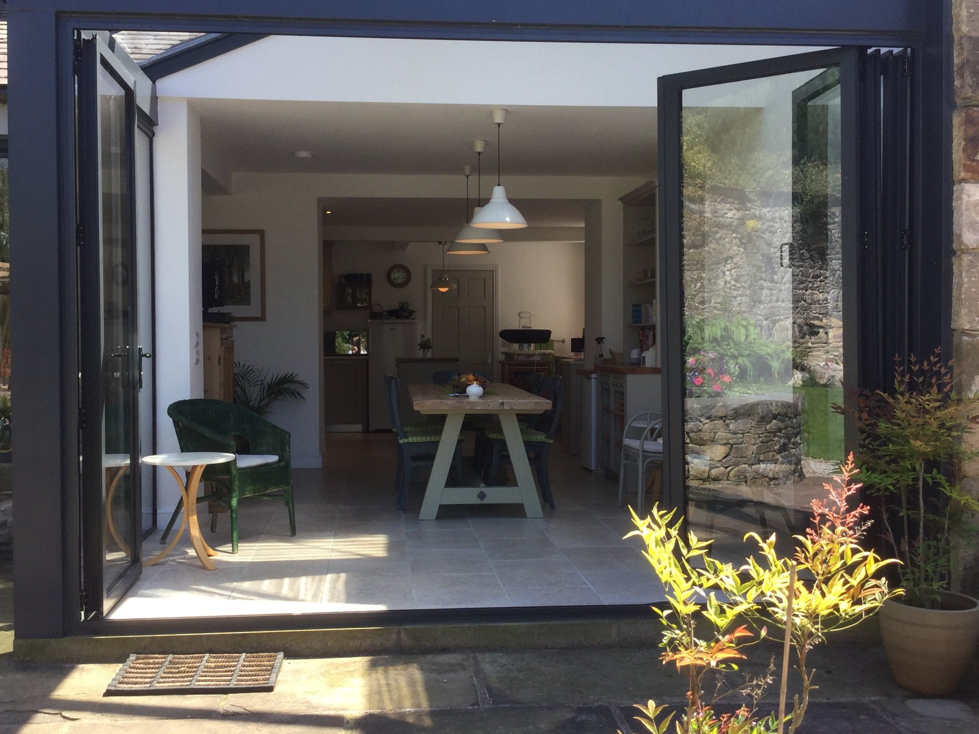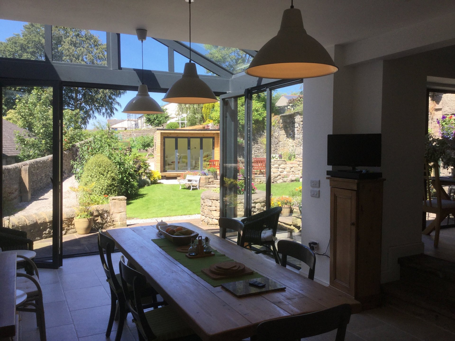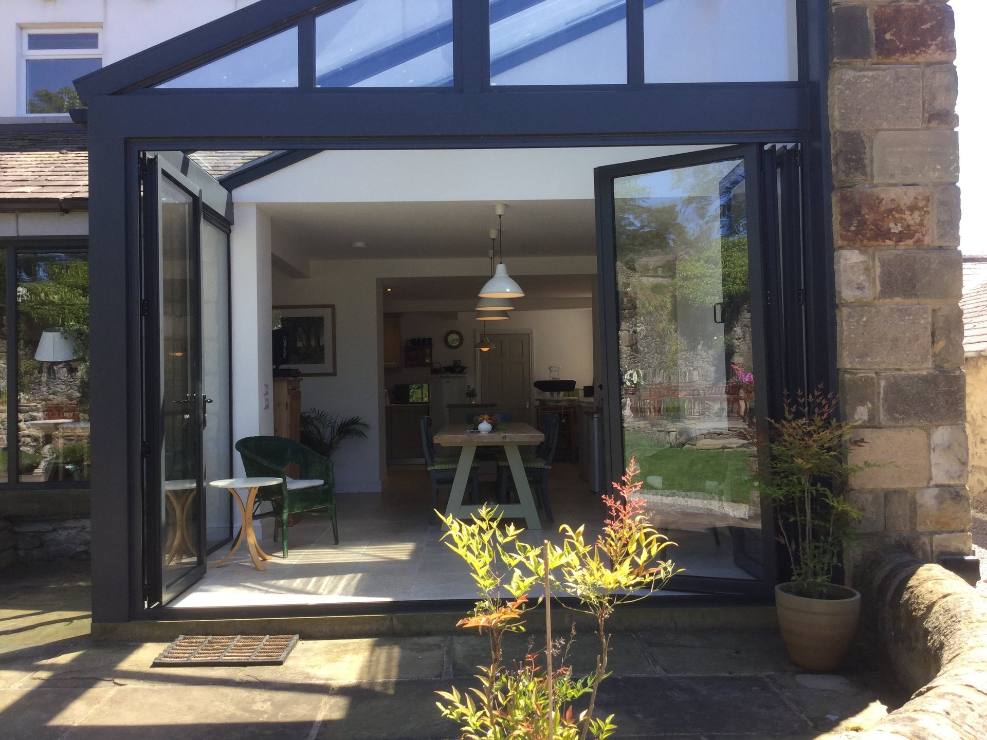 Market town centre location with walled garden. Former house and associated commercial store combined to create increased living space and fluid connection to outside. glazed lean to onto solid flank wall giving light to the dark interior space with big sky impact. Designed to mirror neighbouring roofscape with contemporary walled garden glass house aesthetic. completed 2015. design, planning and listed planning, building regulations and project management.