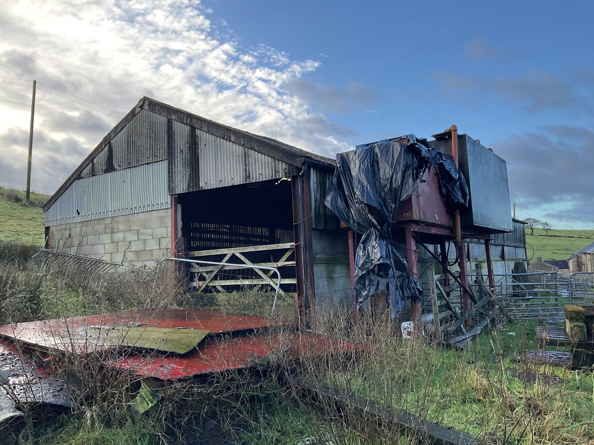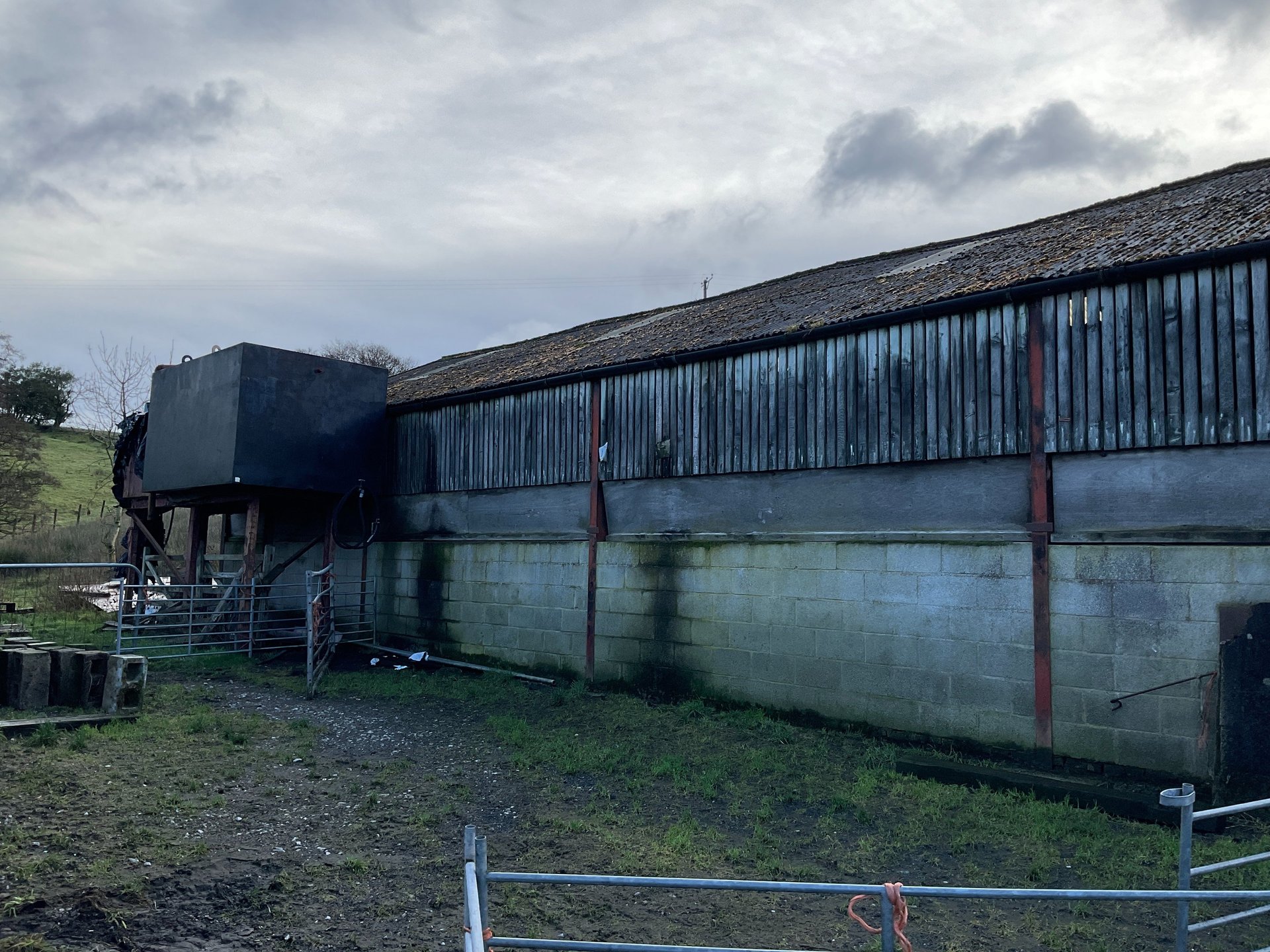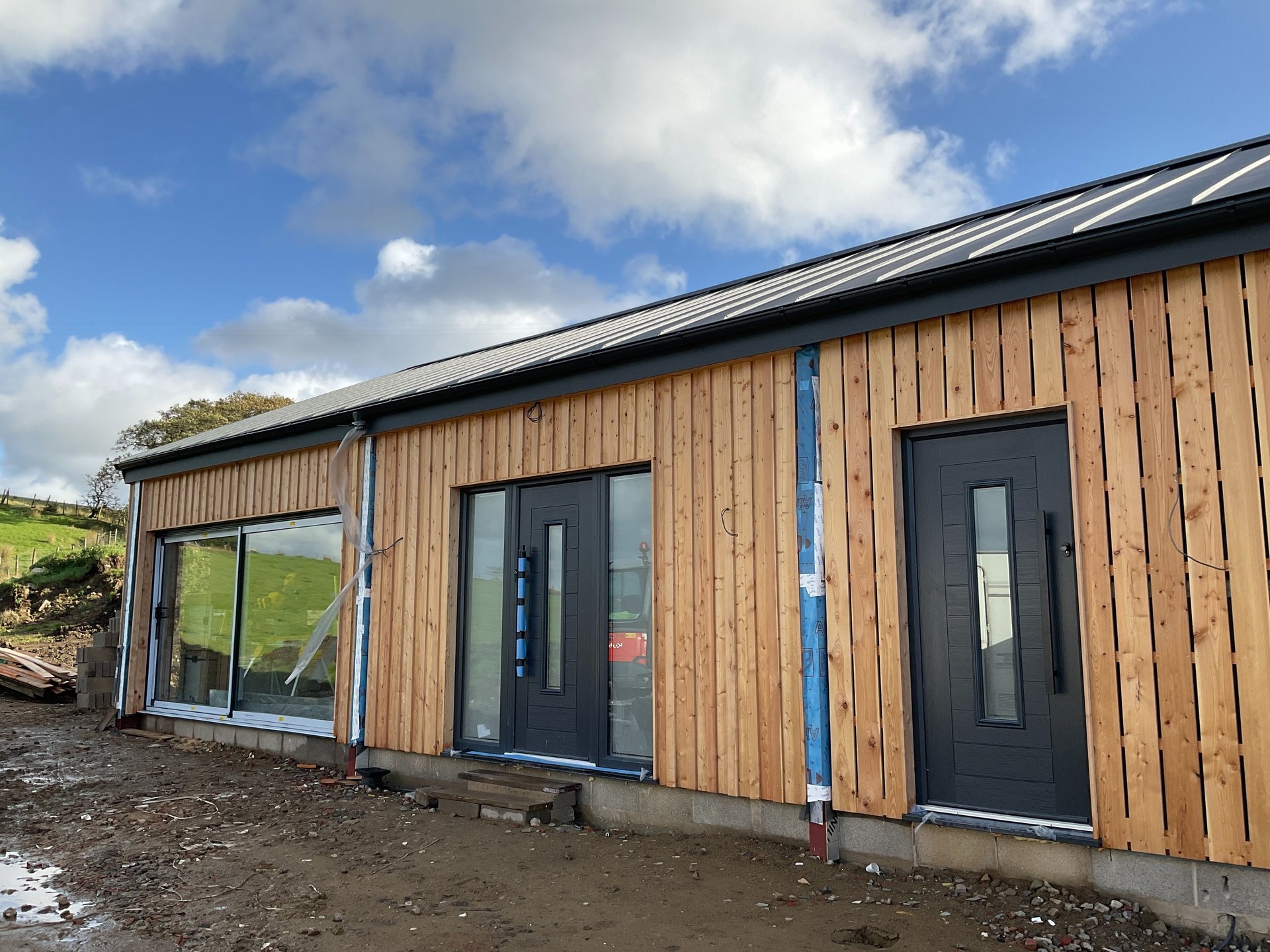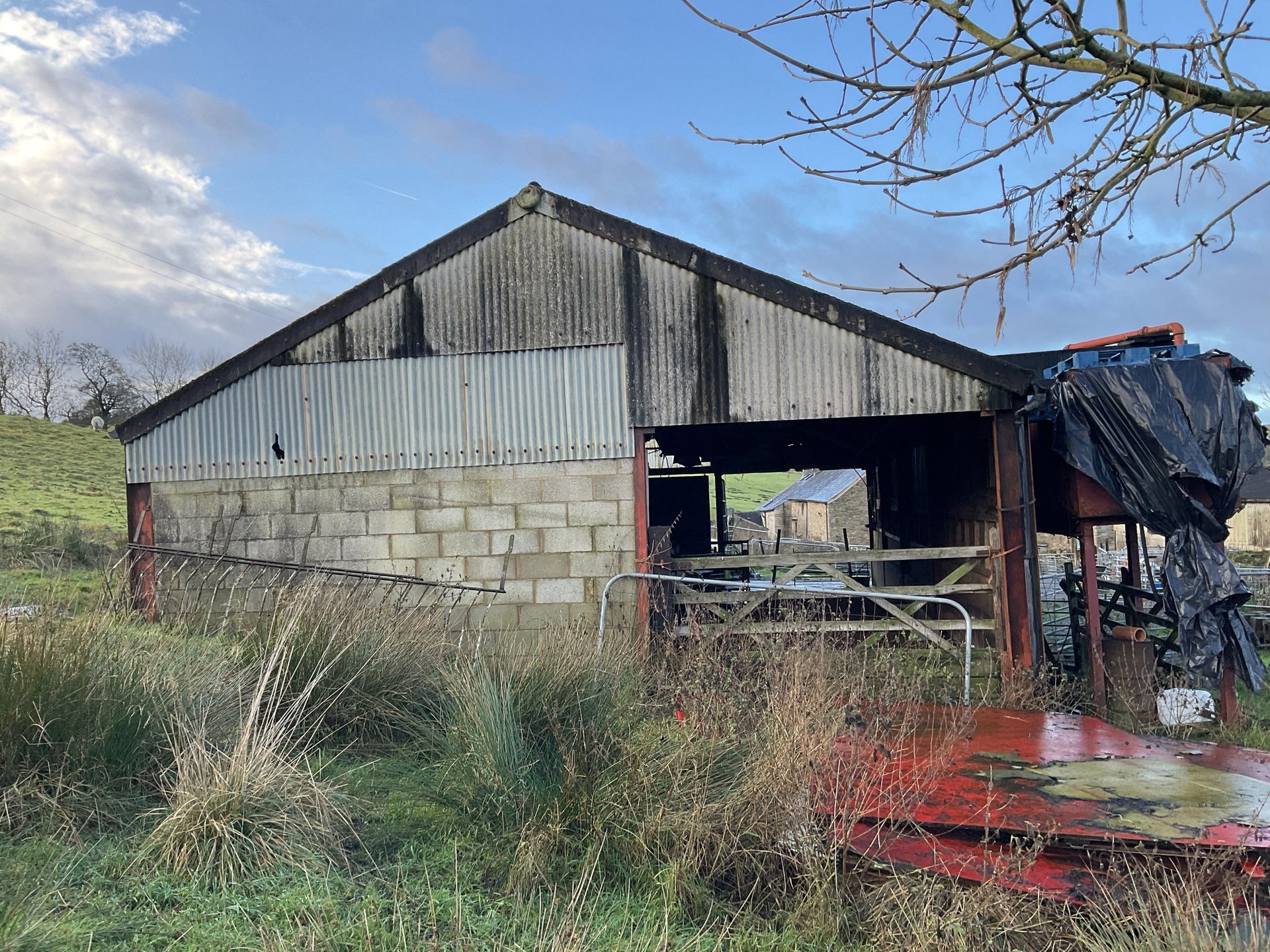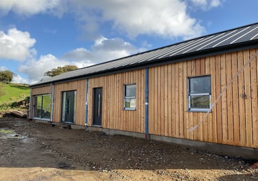 Conversion of redundant steel portal frame and concrete block agricultural building working within the constraints of class Q permitted development planning legislation. Designed to retain a refined agricultural feel with quality materials such as a raised seam roof and larch cladding. Larch cladding will silver up and naturalise to blend with environment and become more unified with the roofing material. The interior is a warm welcoming open planned space with bedrooms and bathrooms grouped to one side and a vaulted living, dining and kitchen area with large glazed panels onto open countryside. On site near completion 2025, Design planning drawings and building regulations.