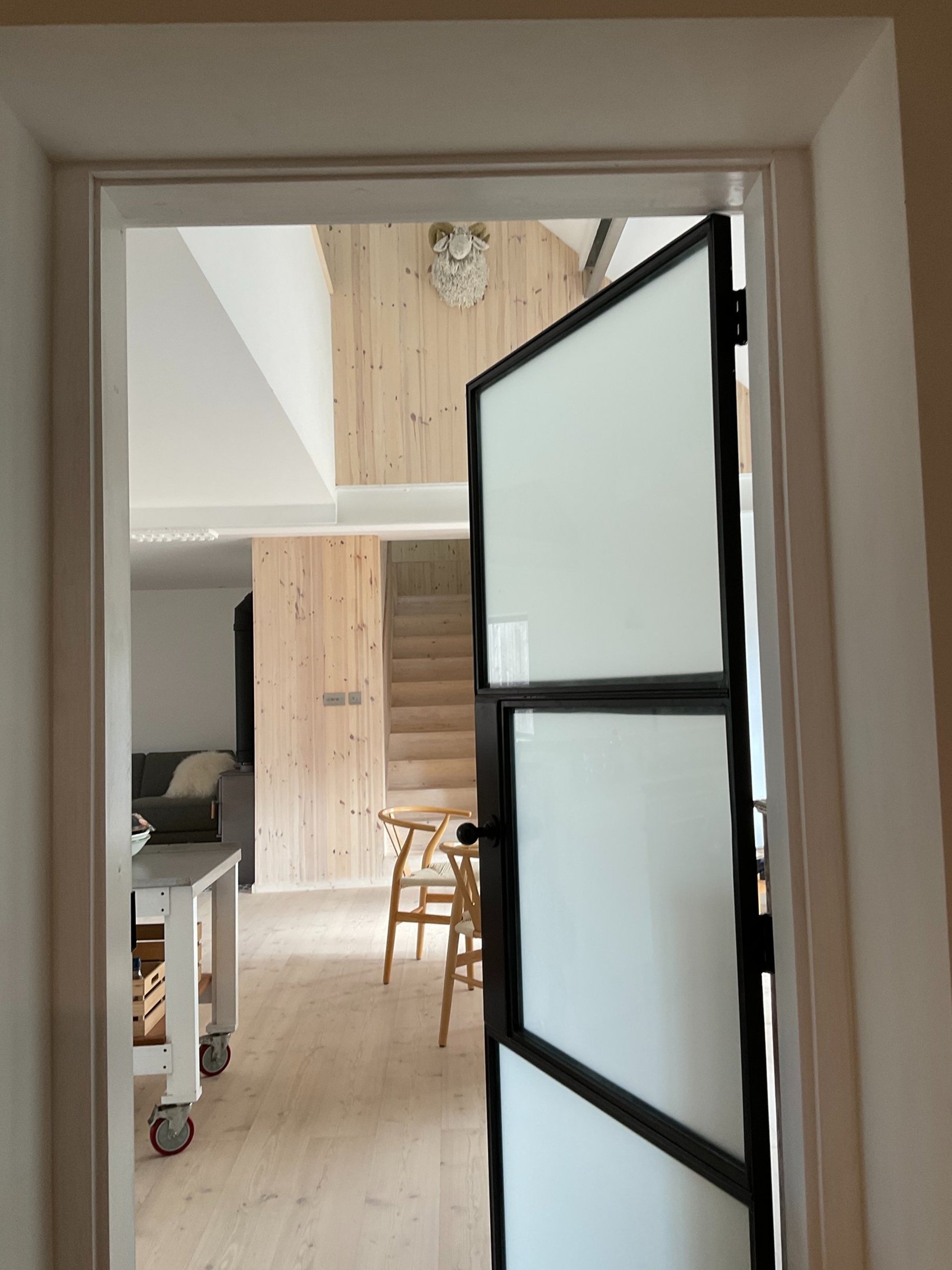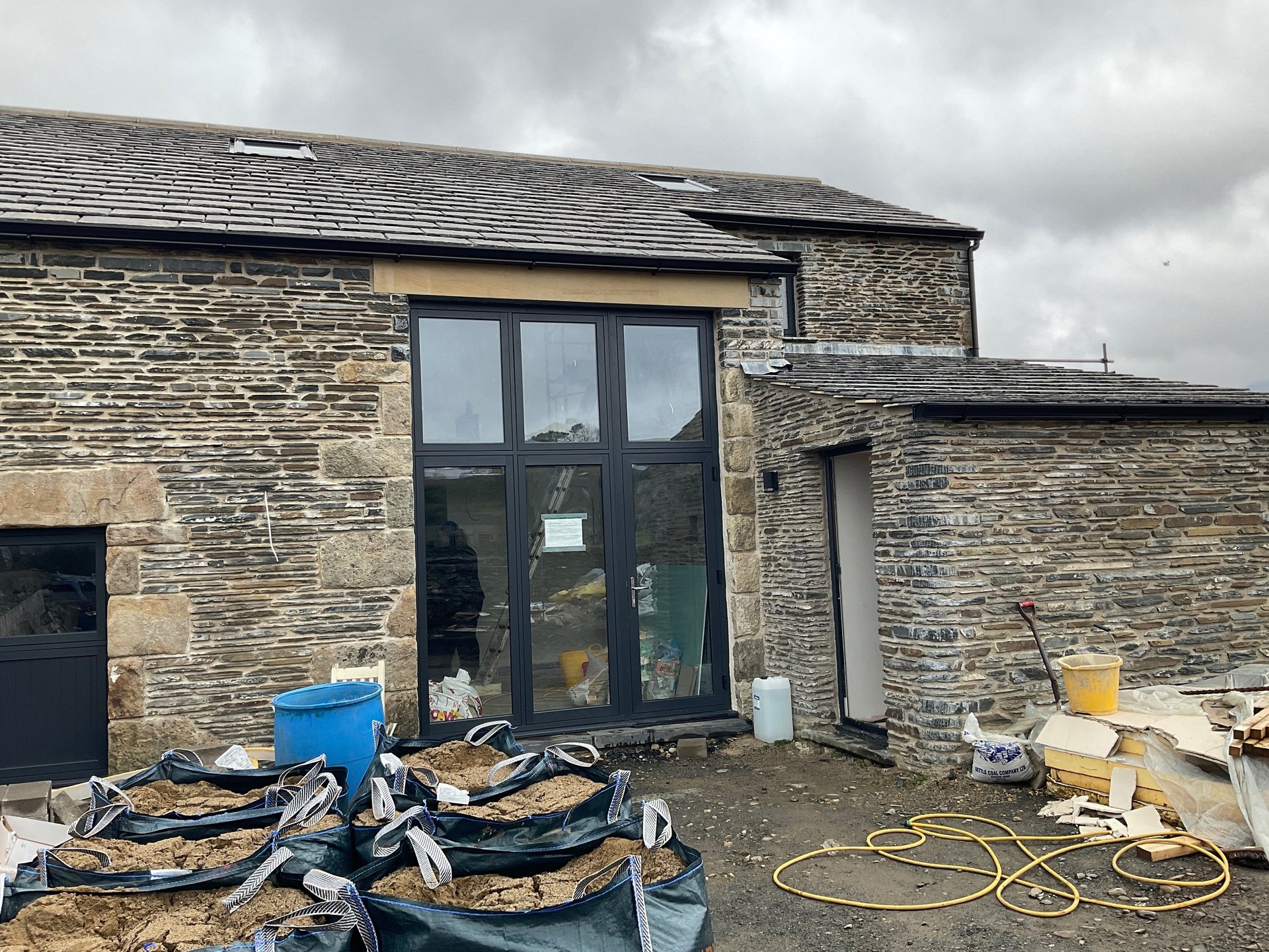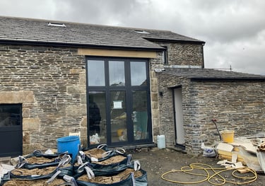 National park rustic roadside barn with bedrooms on ground floor and living space on first floor to take advantage of long distance views and light. Typical barn conversion in the national park where we are limited to existing openings so borrowed light from the original cart entrance is necessary, bedrooms located on ground floor designed around existing window openings for means of escape. on site near completion 2025. Design, planning, building regulations.