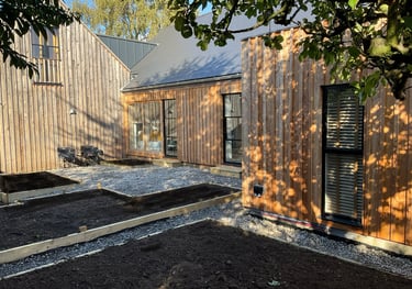 Re-modeling and extending of estate bungalow to create 2 large satellite bedrooms with dedicated bathrooms. The pitched roof extension mirrors the existing bungalow footprint and houses a large bedroom and en suite to the first floor over a large garage/hobby space. Most of the internal walls of the original bungalow were removed with one large steel inserted to pick up the roof structure and gallery/office to the new first floor. The ground floor is now a social space combining kitchen/dining and living areas with a separate utility room. A new flat roof extension houses the second bedroom and bathroom. The building has been insulated to a high level and provides low running costs. The larch cladding will silver up over time and was chosen to naturalise the building in its environment whilst creating a low key garden pavilion feel. completed 2025, design,planning and building regulations.